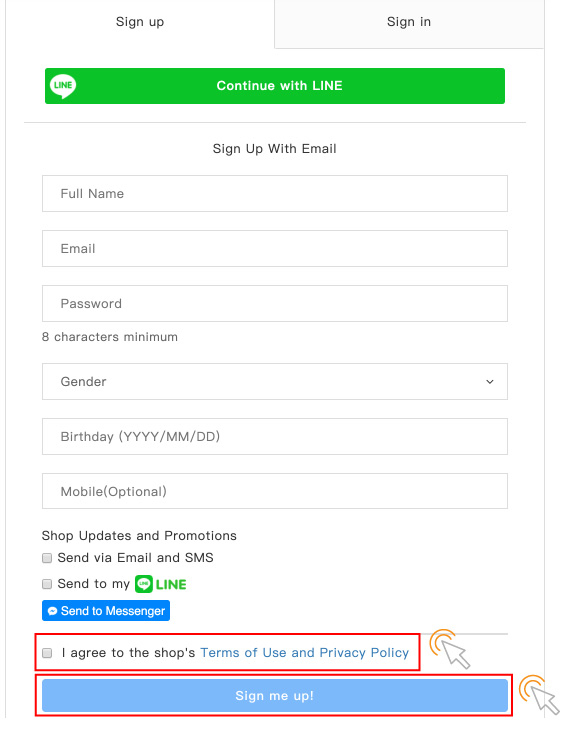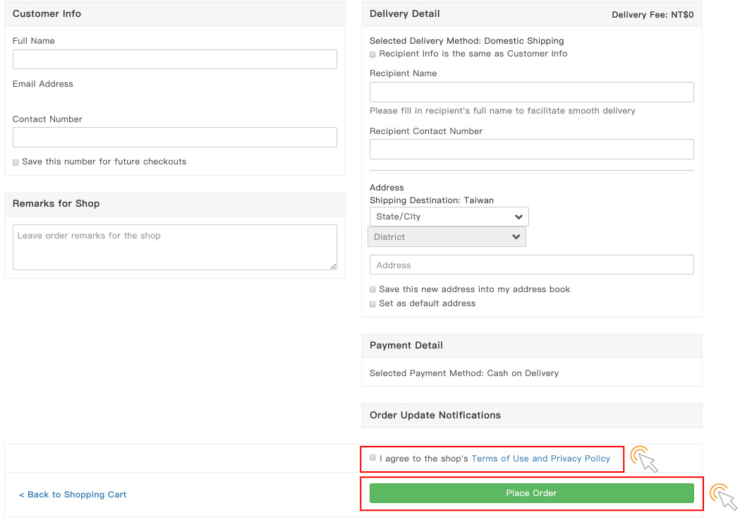 Please correctly enter the customer info and delivery details. Finally, click [I agree to the shop's Terms of Use and Privacy Policy] and [Place Order].