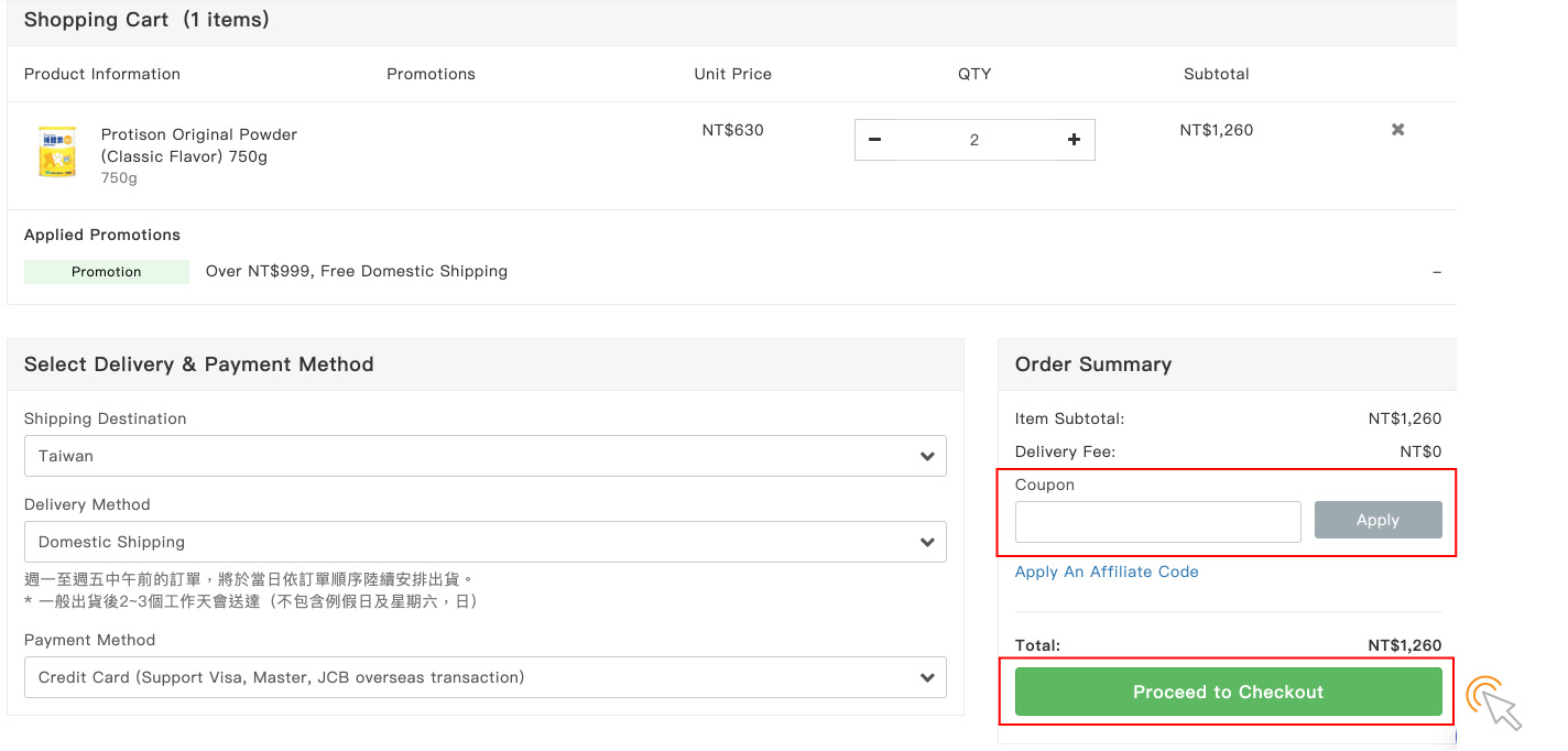 After finish selecting the shipping destination, delivery and payment method, please proceed by clicking [Proceed to checkout]. If you have any available coupon, the system will automatically apply the coupon.
