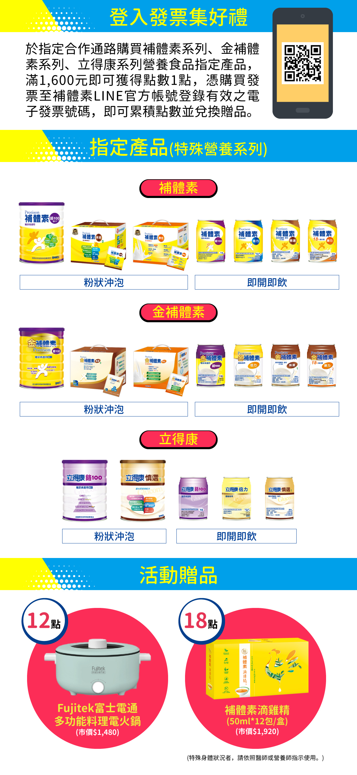 ■須為補體素系列、金補體素系列、立得康系列營養食品的合作通路銷售開立之發票,始可參加本活動,每張發票不可重複集點。