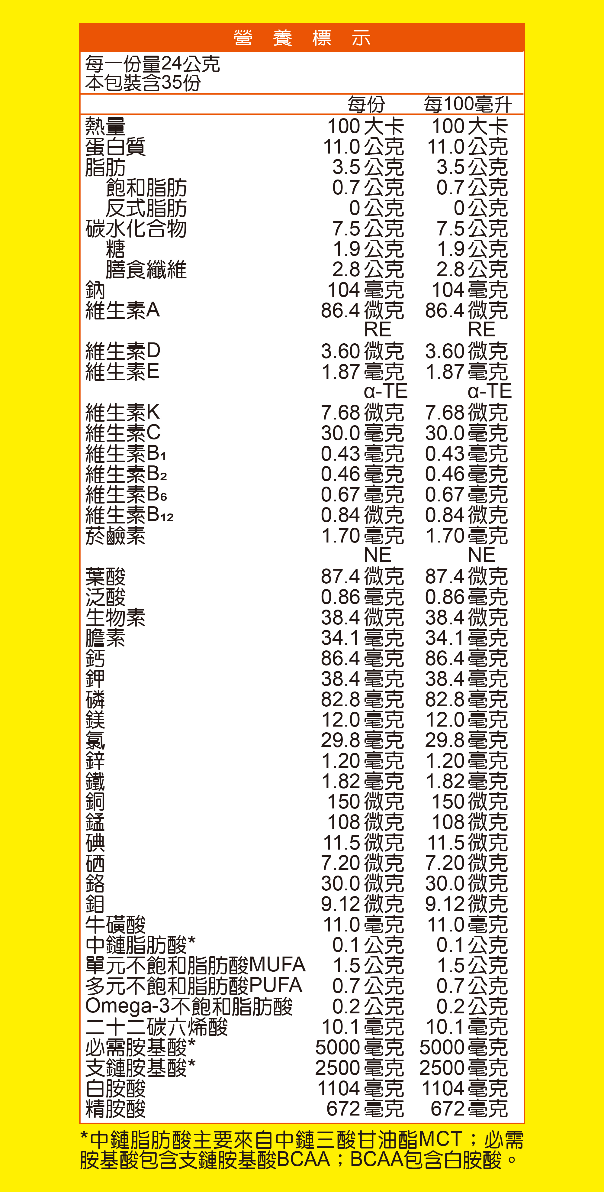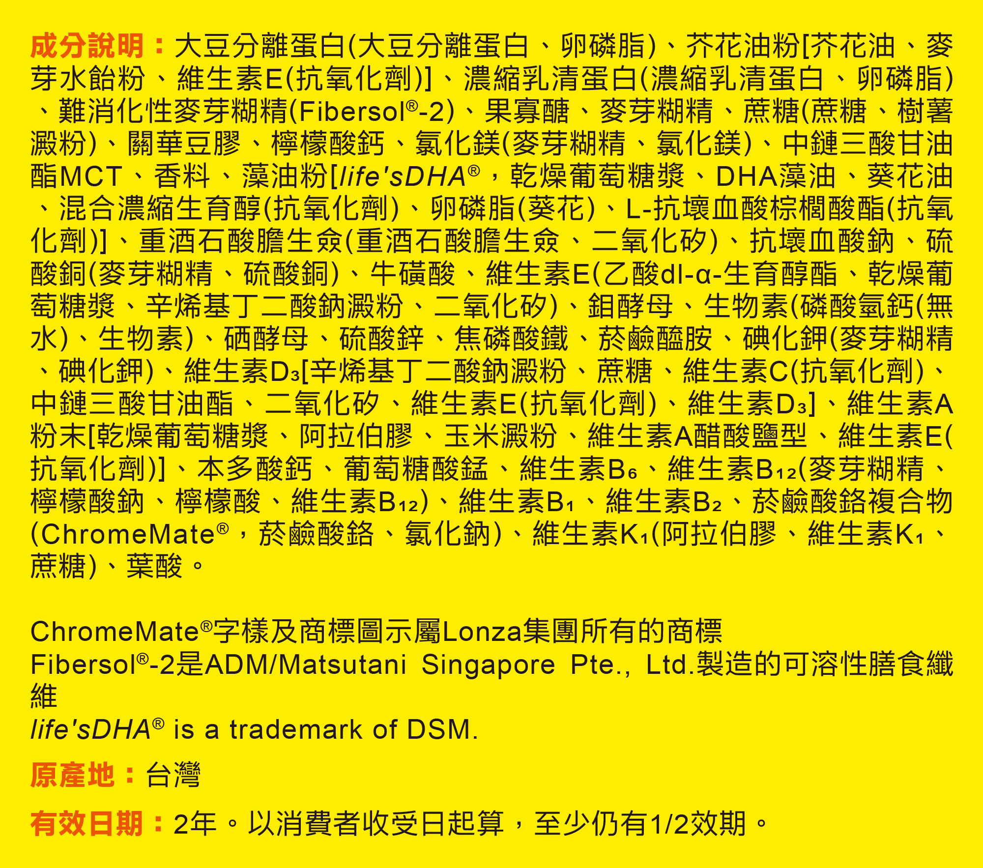 ●本產品為一般營養食品,僅限口飲補充適用,不可作為唯一營養來源,如遇特殊身體狀況者,請依照營養師或醫師指示使用。