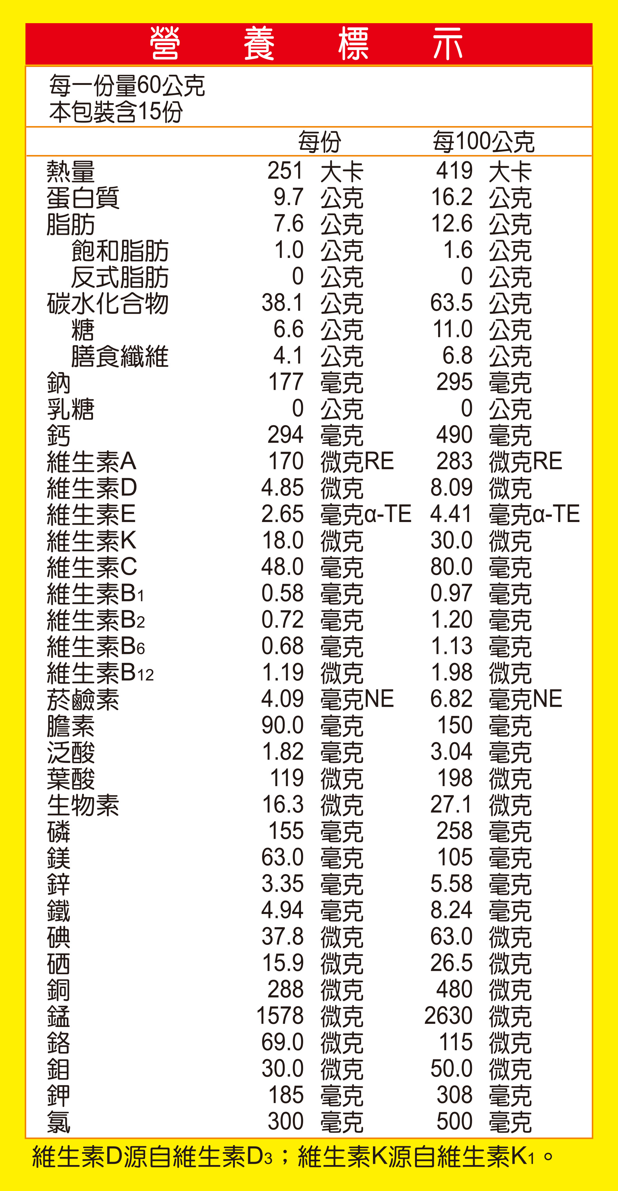 ●每日1500大卡(約6份) 可達到衛生福利部國人膳食營養素參考攝取量(DRIs)之每日礦物質與維生素建議。(氟除外)