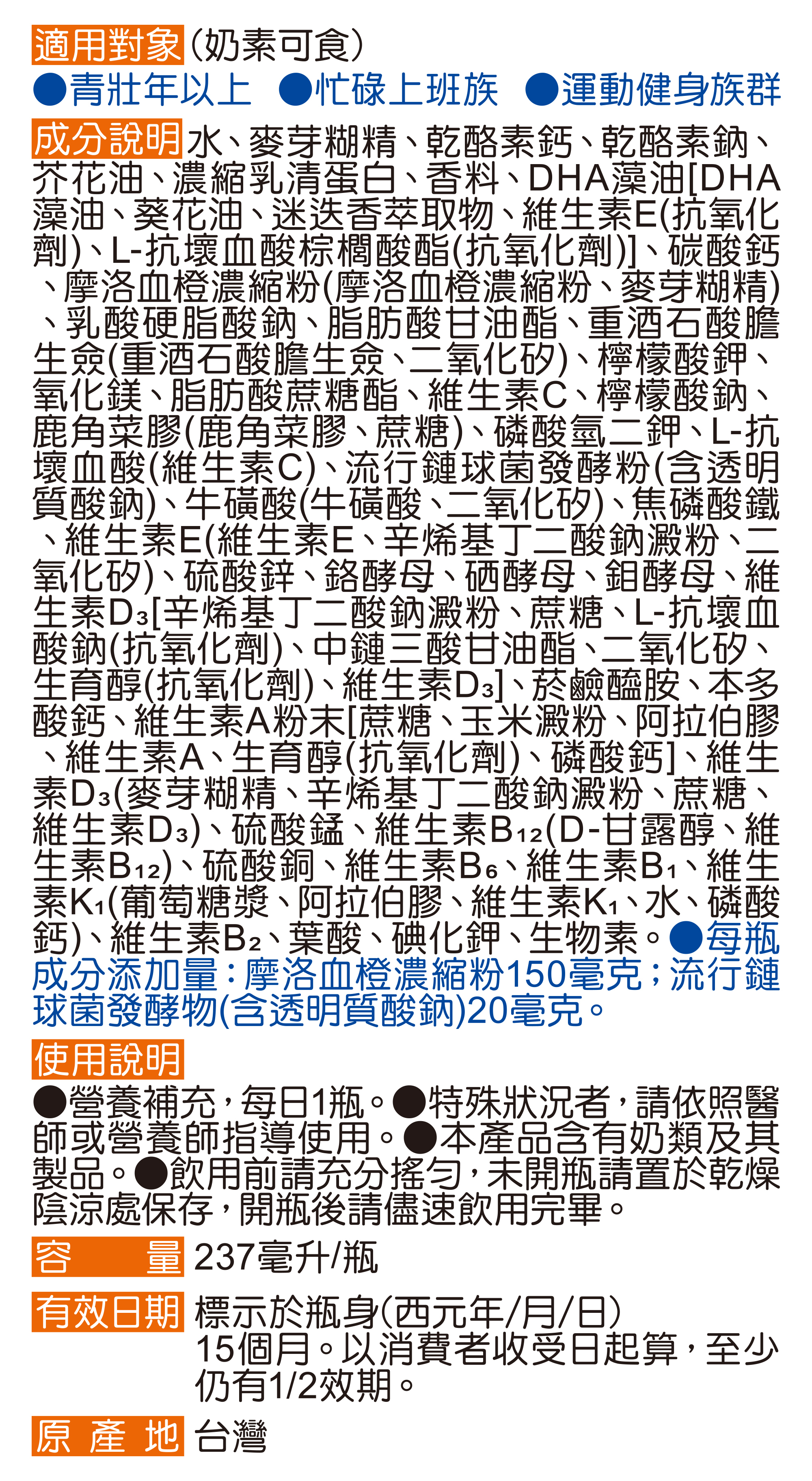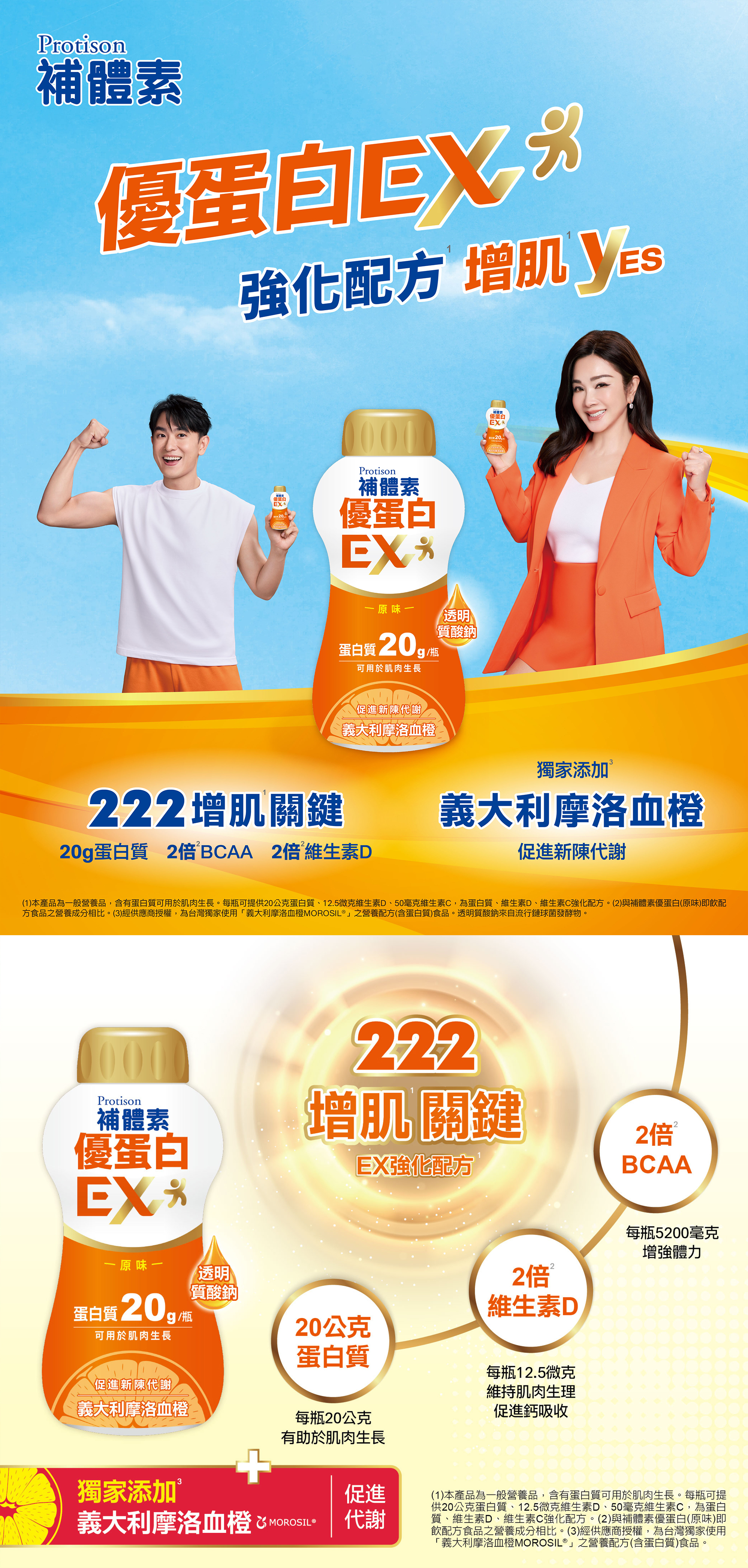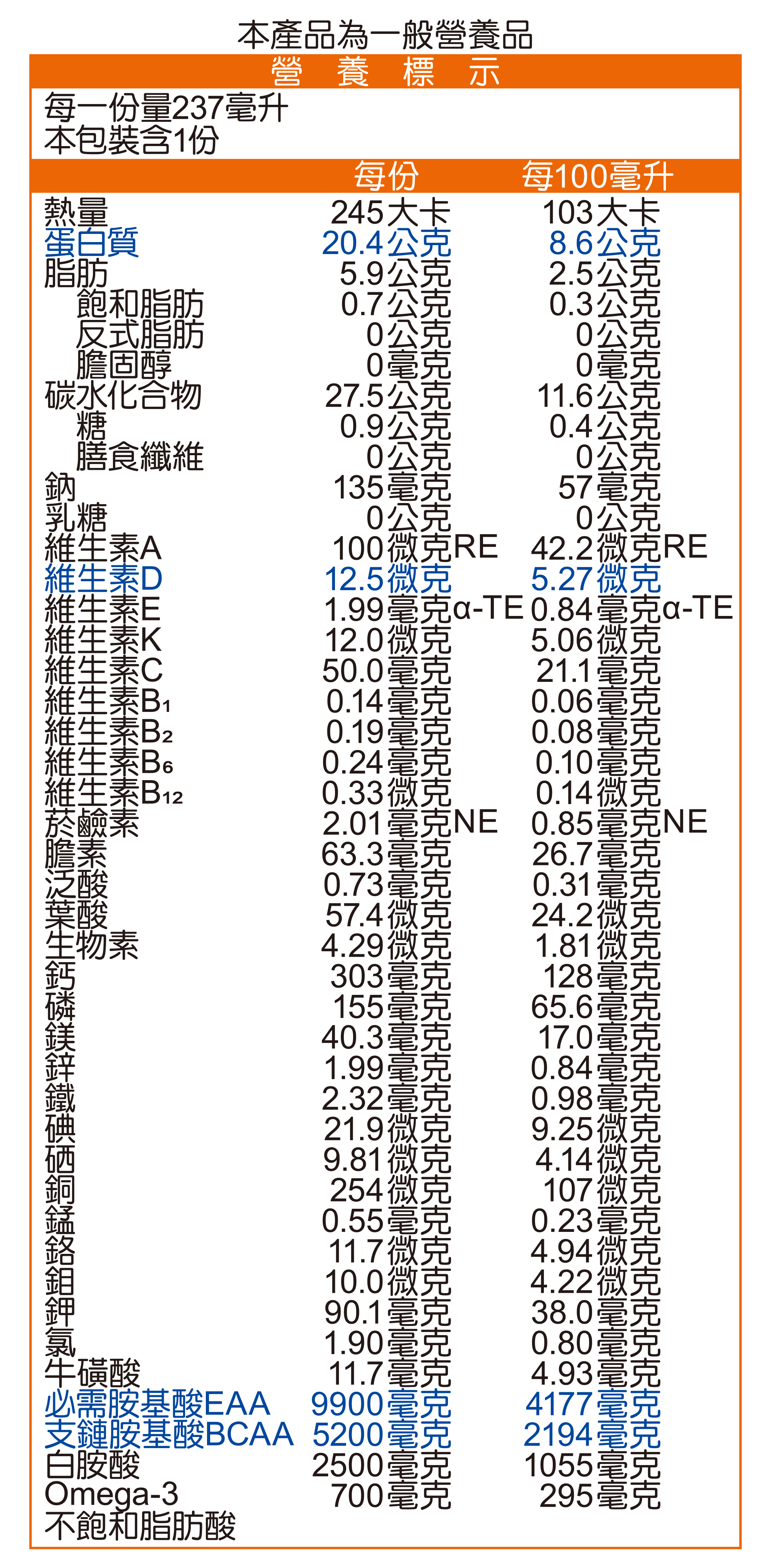- 增肌關鍵222:20公克蛋白質、2倍BCAA、2倍維生素D